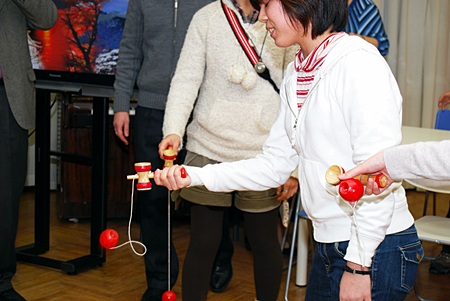 После этого японские студентки отделения русского языка филологического факультета МГУ провели небольшую веселую викторину на тему ‘Что вы знаете о Японии?’. Ребята довольно долго искали на карте Японию, но зато потрясли всех знаниями о героях японских манга и мультиков. Затем студентки поиграли вместе с залом в несколько японских народных игр – в том числе в японский вариант ‘веревочки’ и ‘кэндама’ (в ходе игры игры ‘кэндама’ шарик подбрасывается и ловится на специальную рукоятку или в чашечку), исполнили вместе с нашими детьми музыку на русских национальных инструментах и поводили хоровод.