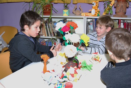 В это время мастера оригами и икэбана готовились к серьезным занятиям, разрабатывали ‘стратегию’ - ведь ученики на сей раз были необычные: учителя предупреждали, что детям трудно удерживать внимание на одном предмете более 15 минут. В итоге решили разделить аудиторию на 2 группы. Кто хотел – остался на мастер-класс по икэбана, кто хотел – побежал на занятие по оригами. Многие по нескольку раз перебегали из одного класса в другой, чтобы не пропустить самое интересное.