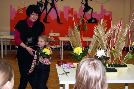 Мастер-класс по икэбана (современное направление ‘Согэцу’) проводила Ольга Фомичева, ведущий российский мастер икэбана и других традиционным японским искусствам. Она имеет высший ранг среди российских мастеров икэбана ‘Согэцу’. Сначала Ольга сделала традиционную японскую новогоднюю композицию ‘кадомацу’, а затем современную - в стиле школы ‘Согэцу’. Дети с восторгом завершали композицию вместе с сэнсэем. Каждый с нетерпением ждал своей очереди, чтобы поставить в композицию свой цветок. Когда была завершена эта невиданной красоты работа, у многих детей (да и у родителей) на глазах стояли слезы радости.